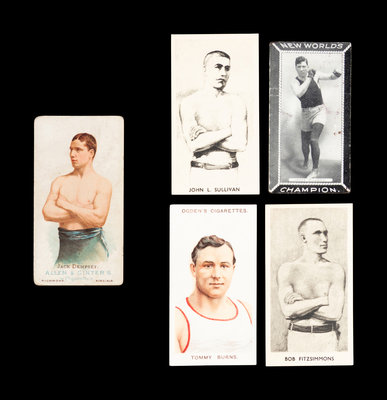 comprising of an 1887 N28 Allen & Ginter Jack Dempsey (nonpareil), 1915 Ogden's Cigarettes Tommy Burns No. 4, 1915 Cope Bros. & Co. Jess Willard and 1938 Cartledge Razor John L. Sullivan No. 18 and Bob Fitzsimmons. Conditions average GOOD to EX. Acceptable for grading.