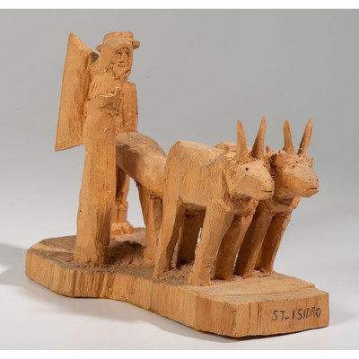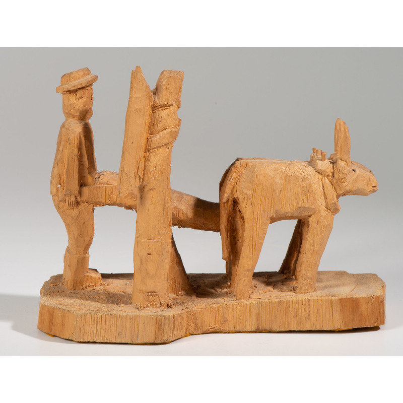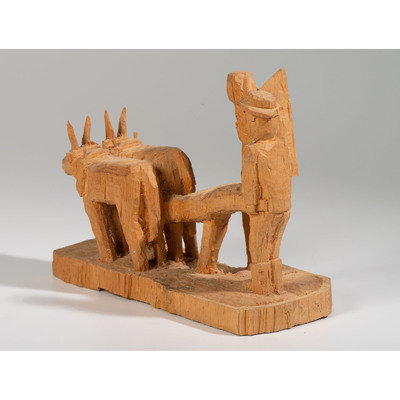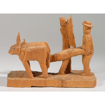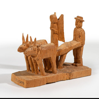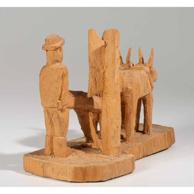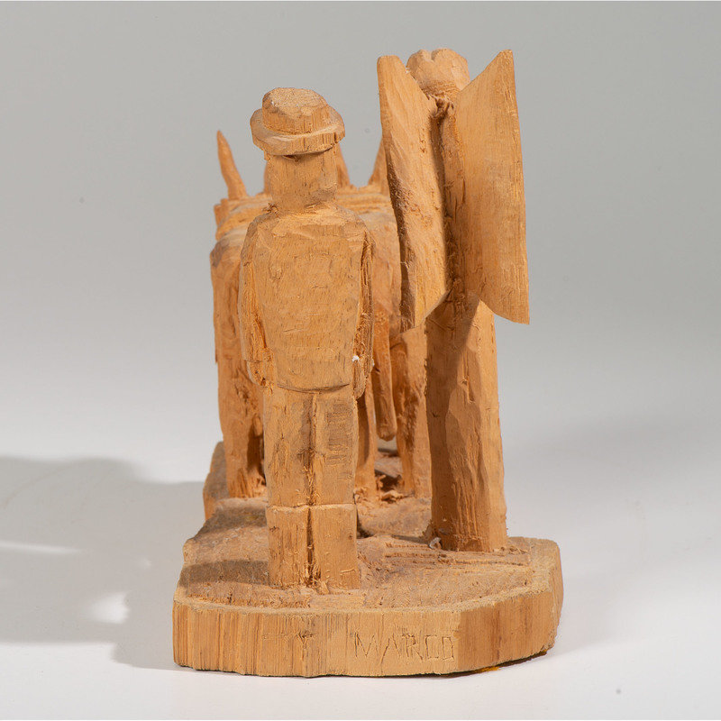 whittled pine, depicting two oxen, a farmer, and an angel; signed Marco on back and titled on front