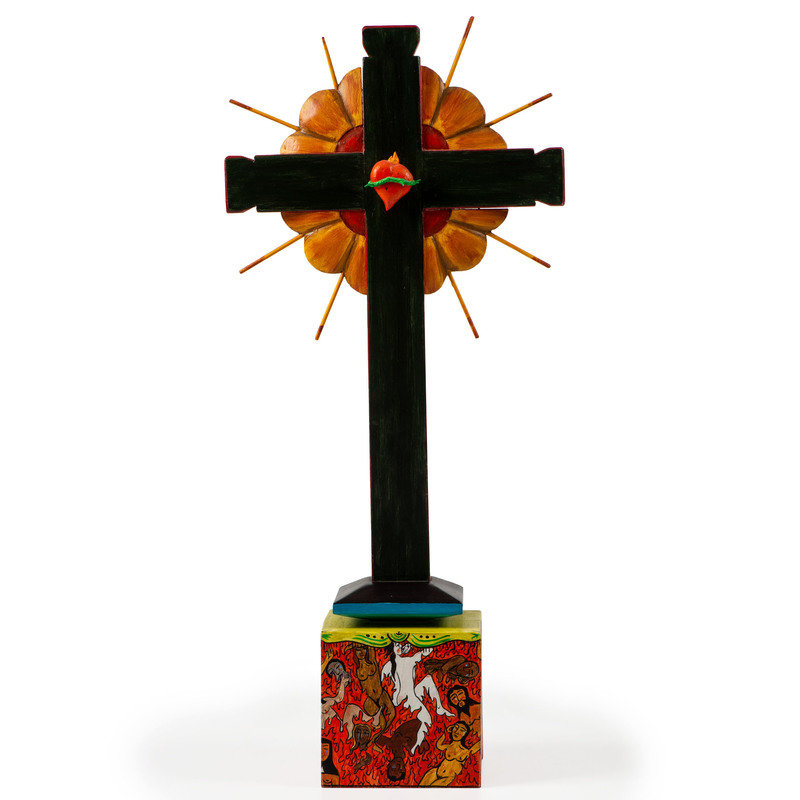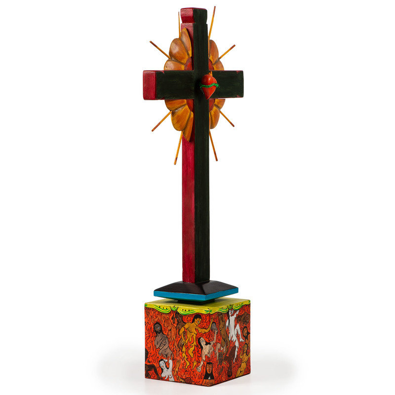 carved and painted cross with Sacred Heart relief at crux on front and verso