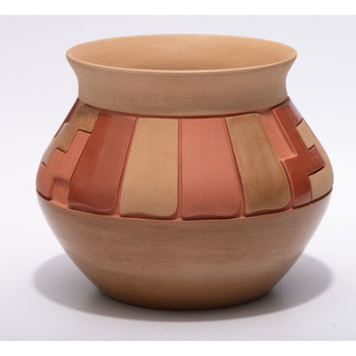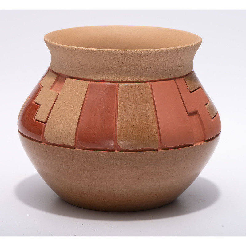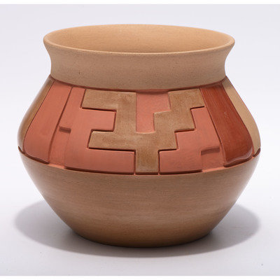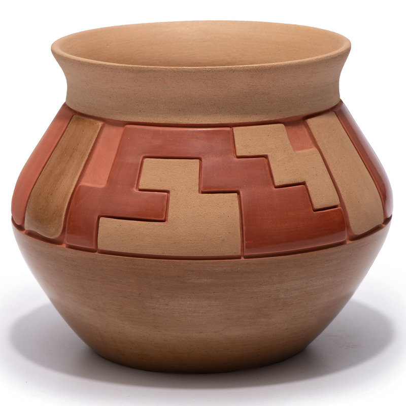 Carved Red and Tan Pottery Jar