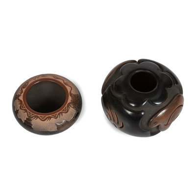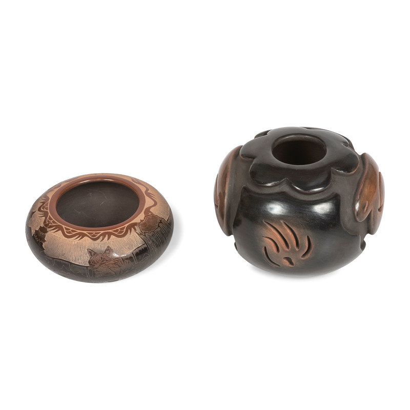 sgraffito designs of Avanyu, mountain lions, and landscape; signed and dated 1995 (base)