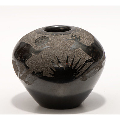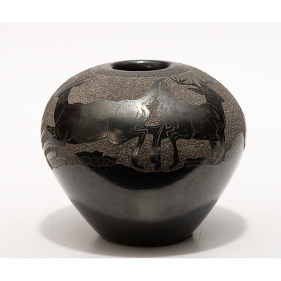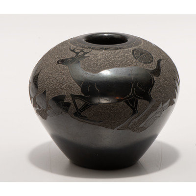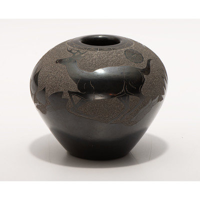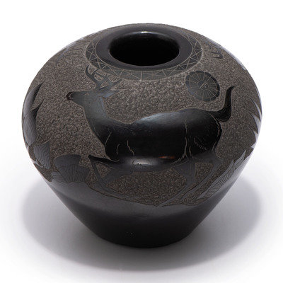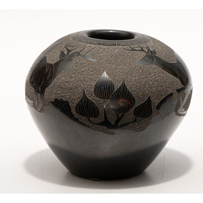 Blackware Sgraffito Pottery Jar, with Deer