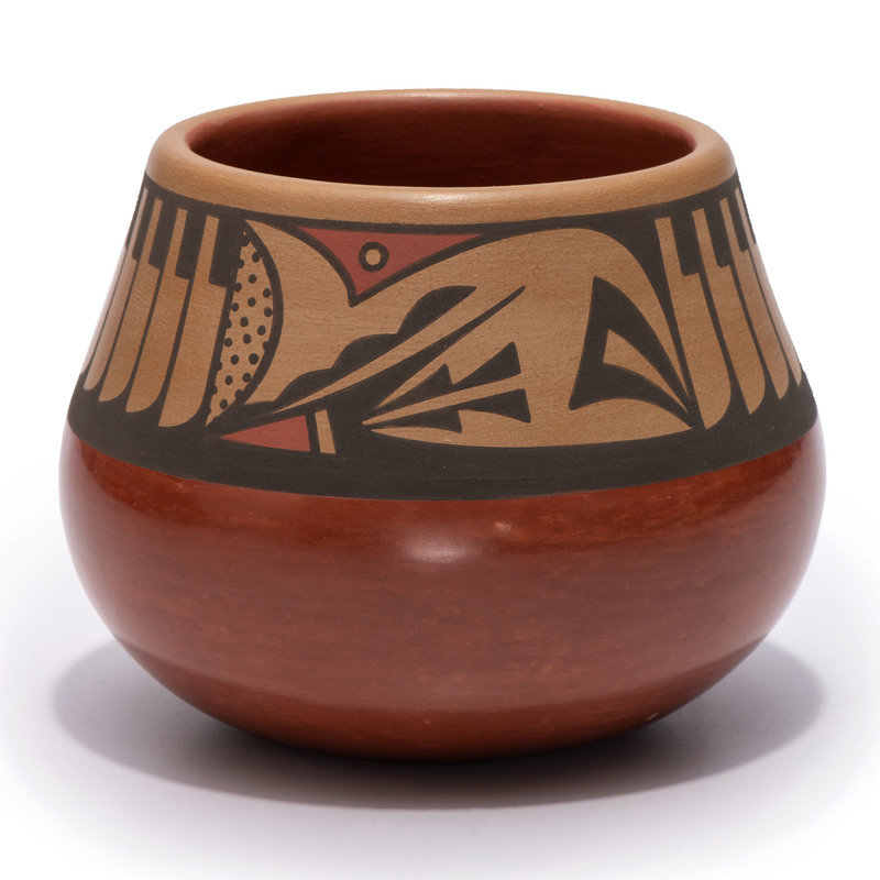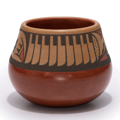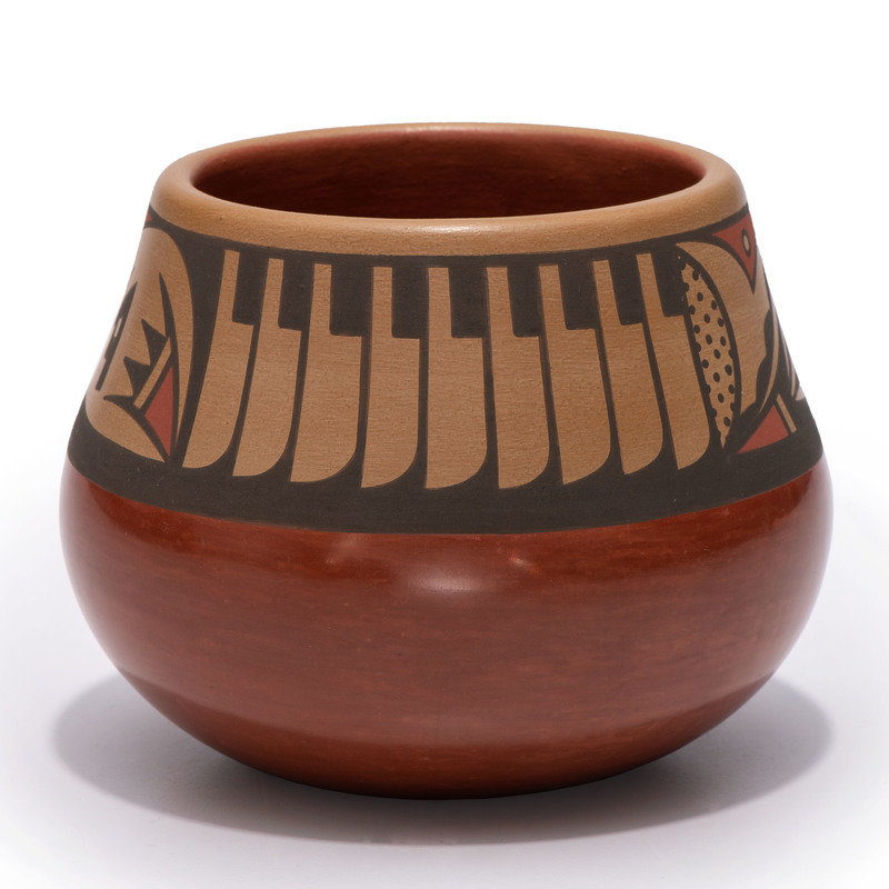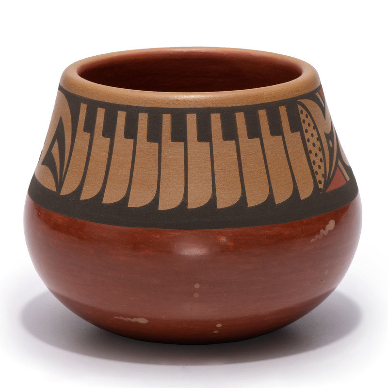 Red and Sienna Pottery Jar, with Repeating Feathers