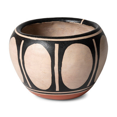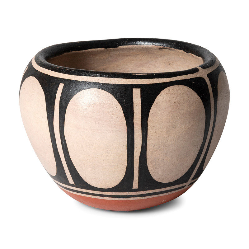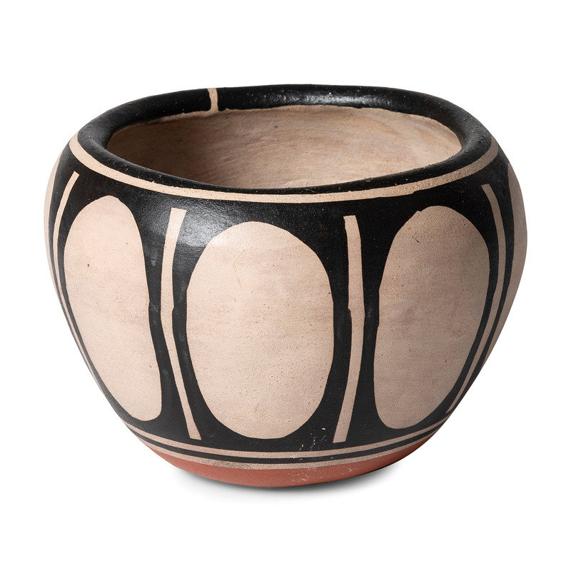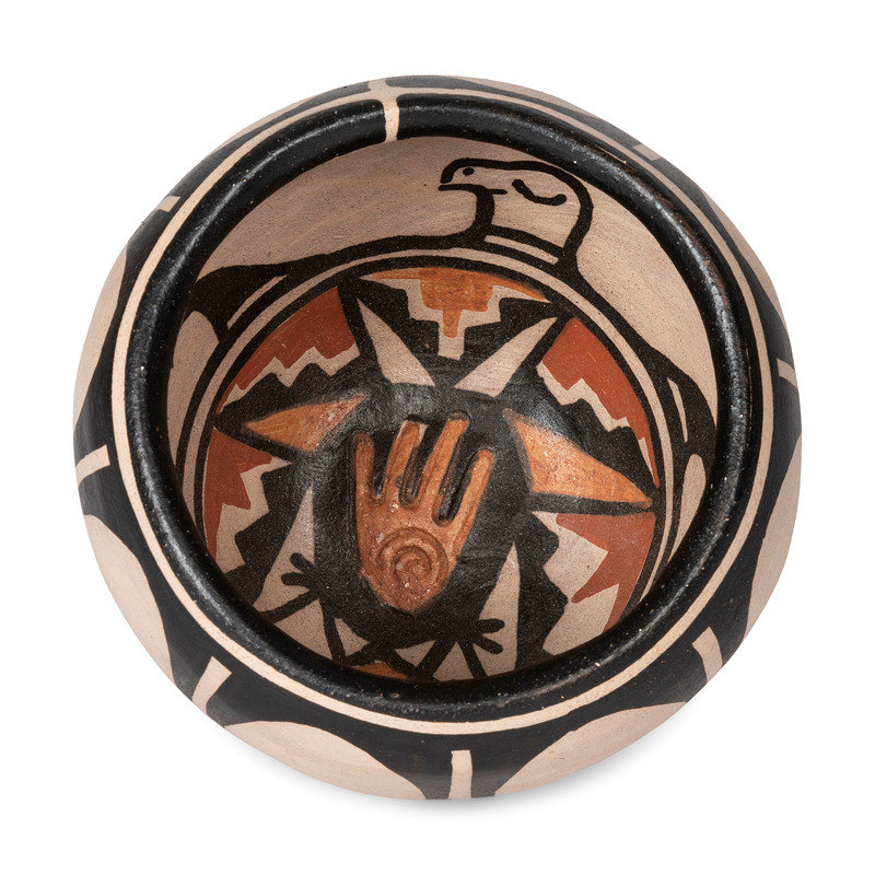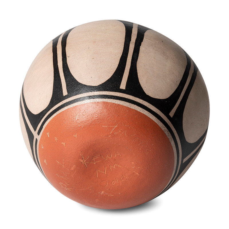 exterior painted with repeating geometric pattern; interior with turtle and Tenorio's hand hallmark; signed and dated on base