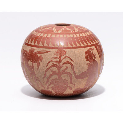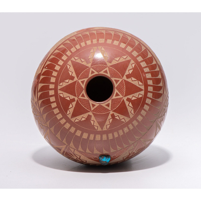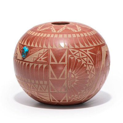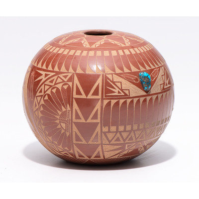 Award-Winning Sgraffito Redware Seed Jar, with Turquoise Cabochon
