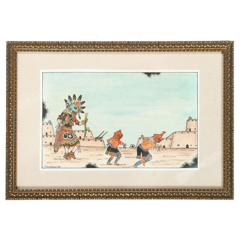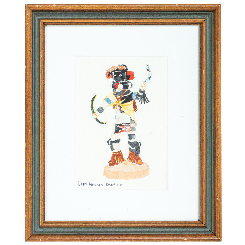 lot also includes unsigned Left Handed Kachina gouache on paper AND Hopi Cachina painted on board signed Geo. H. Watson and titled (verso)