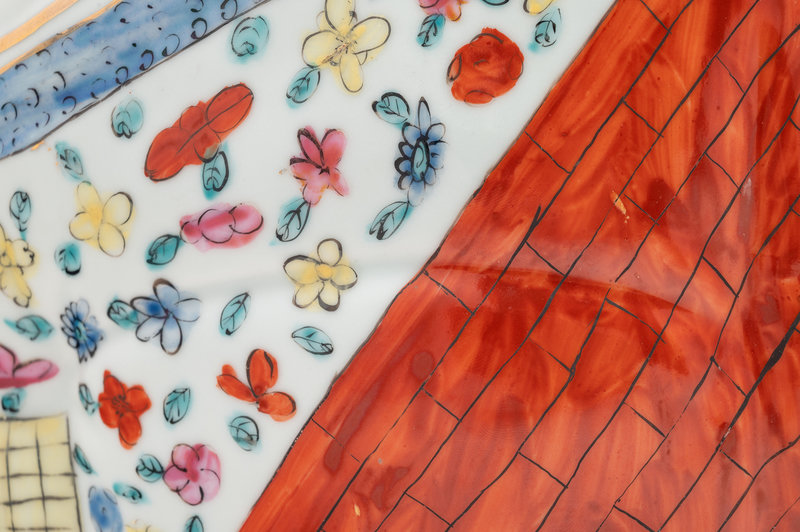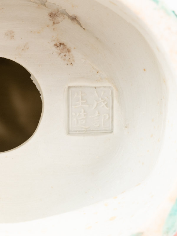 depicting a figure of a seated laughing Buddha, and three standing figures, one of Shoulao, one showing Magu in pink robes, and one Guanyin.