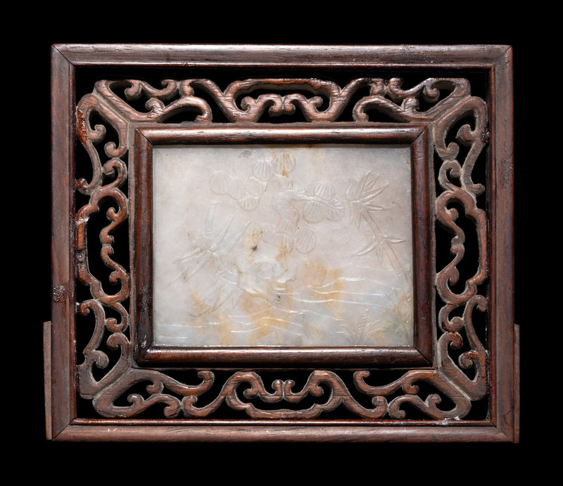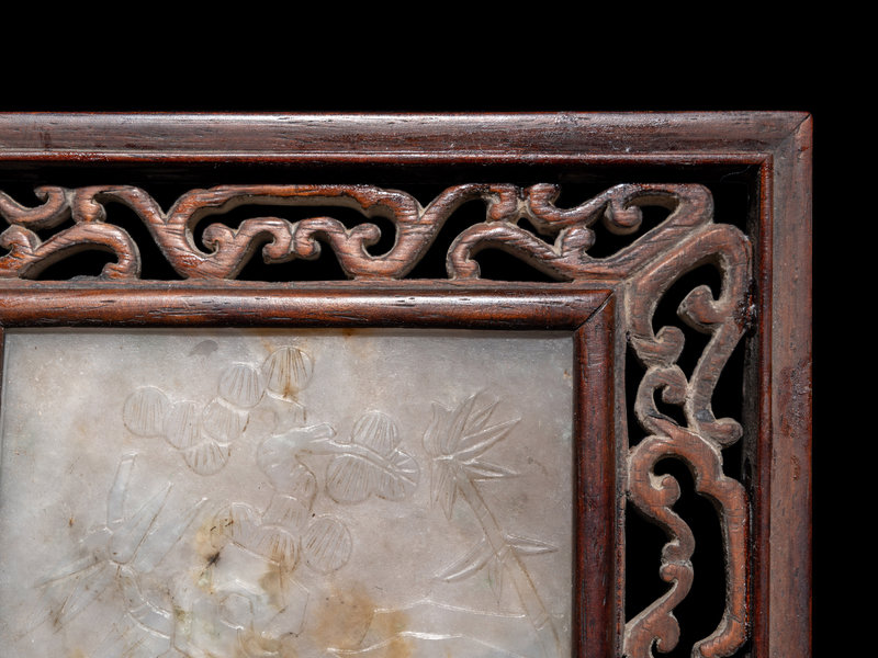 the milky translucent stone of rectangular form flecked with russet blushes, carved in low relief two show bamboo and prunus issuing from craggy rocks, all enclosed within a hardwood frame carved in openwork to show stylized ruyi scrolls.