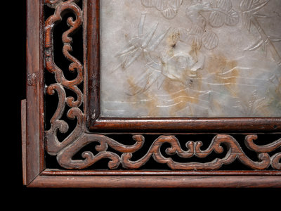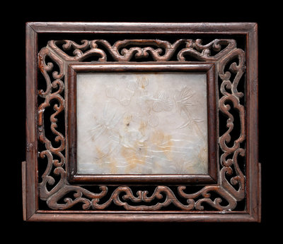 A Chinese Greyish White Jade Inset Hardwood Mounted Panel