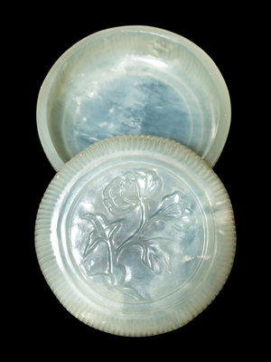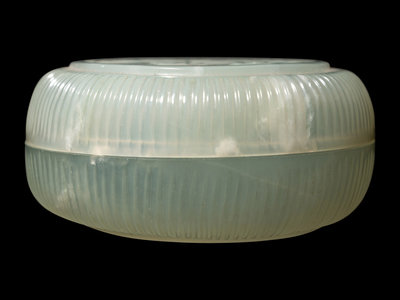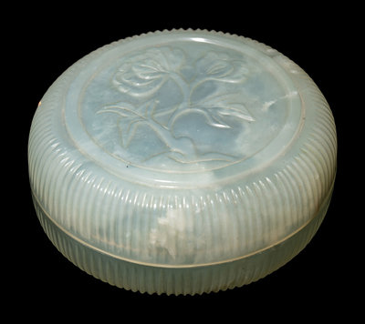 comprising a rounded circular box with ribbed exterior walls, the cover carved in low relief with a floral roundel, and a compressed spinach jade vase flanked by ring handles.