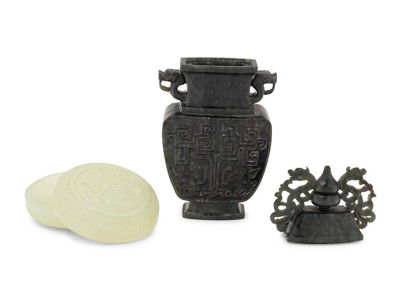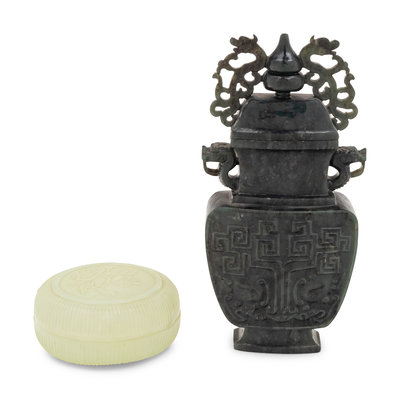 A Small Chinese White Jade Circular Covered Box and A Chinese Dark Spinach Jade Covered Vase