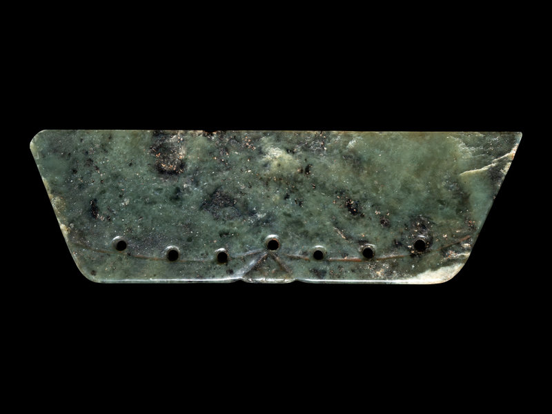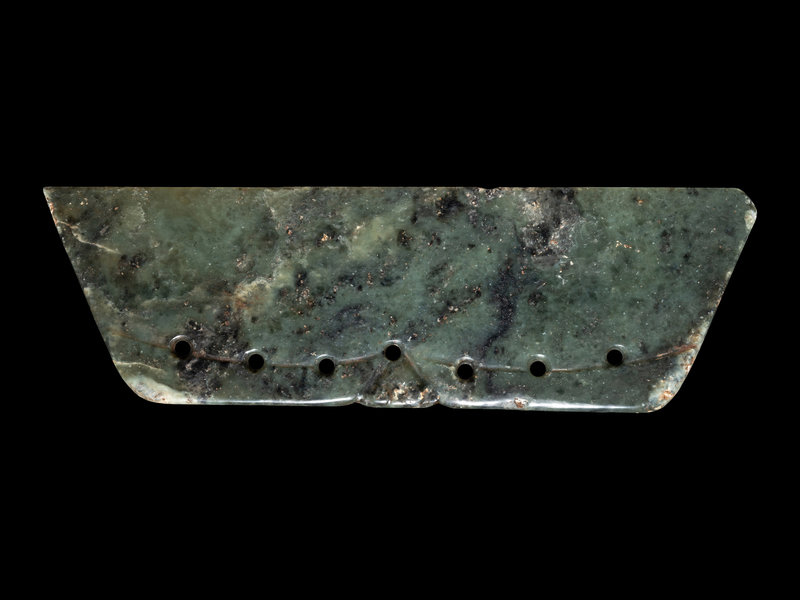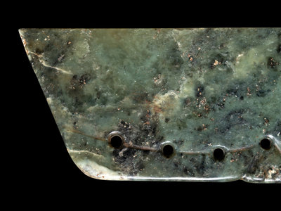 the mossy stone variegated with black and white inclusions alongside russet flecks, carved in trapezoid form to a flaring beveled blade opposite seven vertical pierced apertures; together with a hardwood box with metal mounts.