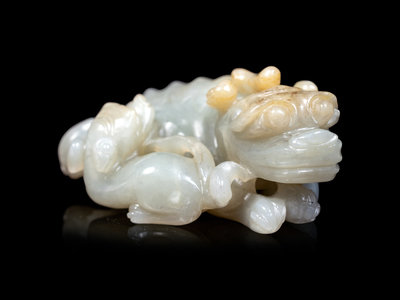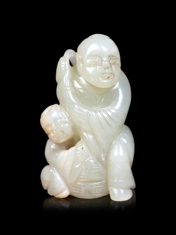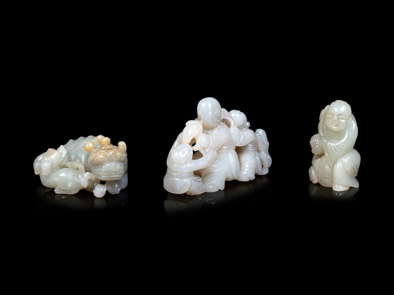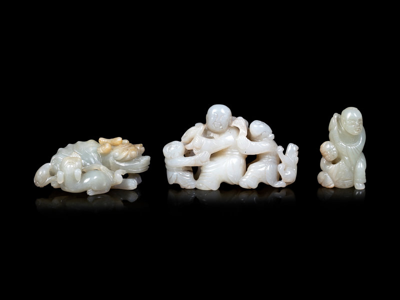 comprising one group of three playing children, a pair of recumbent mythical beasts, and a figure of an old man, each with a soft polish.