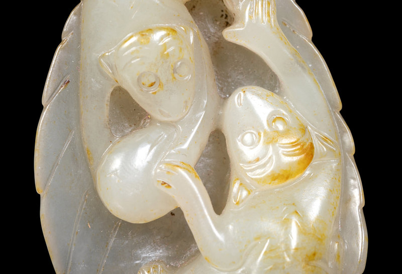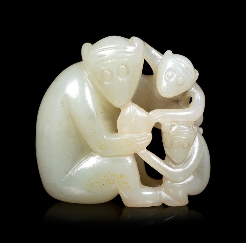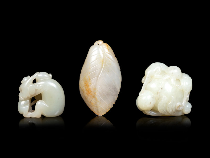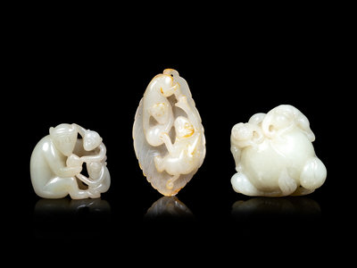 each stone with a soft polish and carved in relief to show a group of monkeys: comprising one example with a embracing pair, one group clambering atop a peach, and one pair resting atop a leaf.
