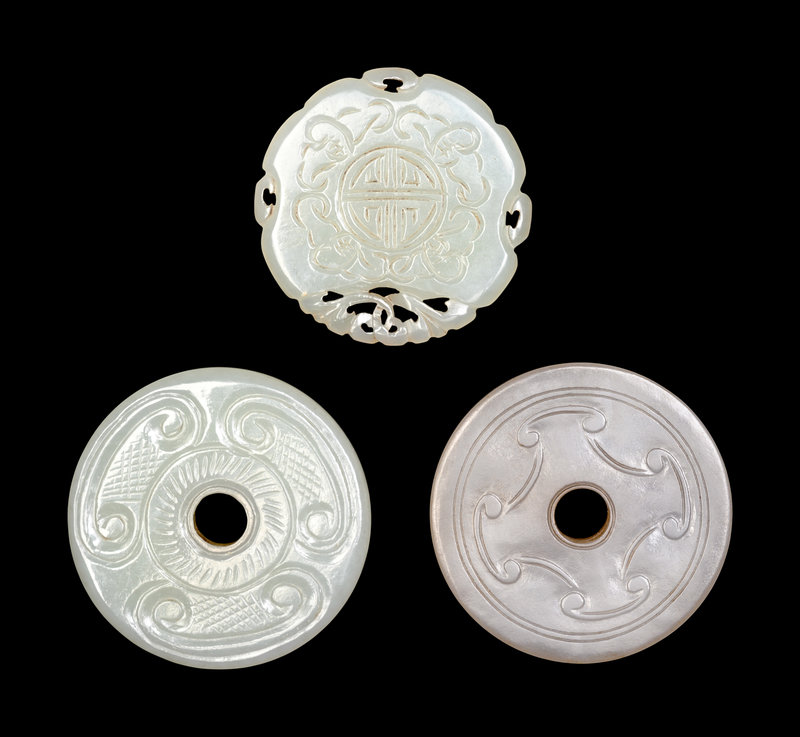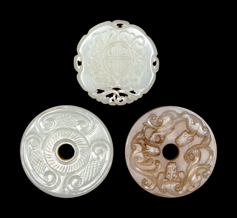 each of circular form, comprising one white jade example carved to one side in relief to show three chilongs, and two celadon examples, one with reticulated edges enclosing bats and shou-roundels, and one with a large aperture within carved ruyi-heads.