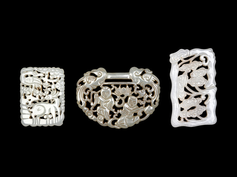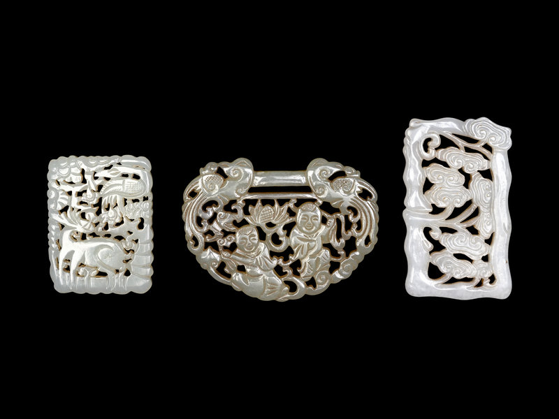 comprising two rectangular examples: one white jade example with a large branching lingzhi fungus, the other a smaller celadon example showing a crane and deer; the third a celadon example carved to show to boys against a reticulated scrolling ground.