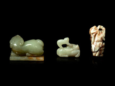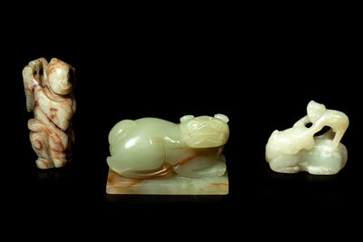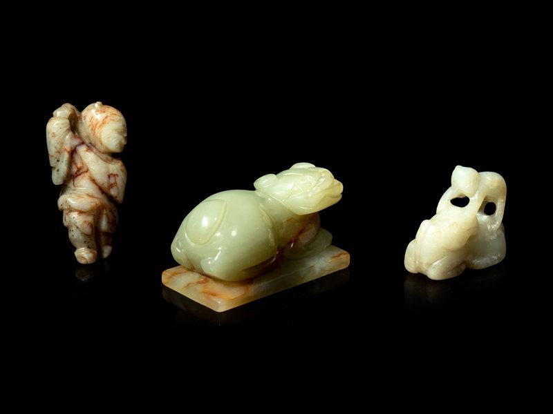 comprising a celadon and russet figure of a dog, a celadon horse and monkey group, and a chicken bone figure of a boy.
