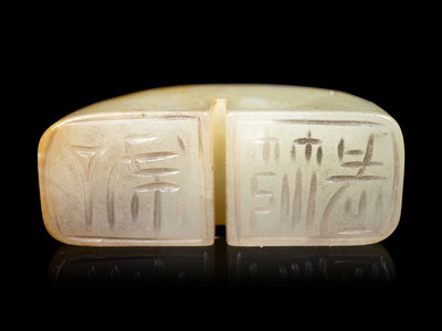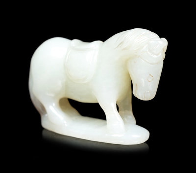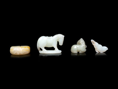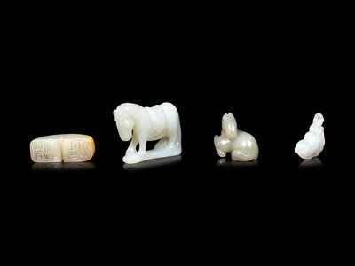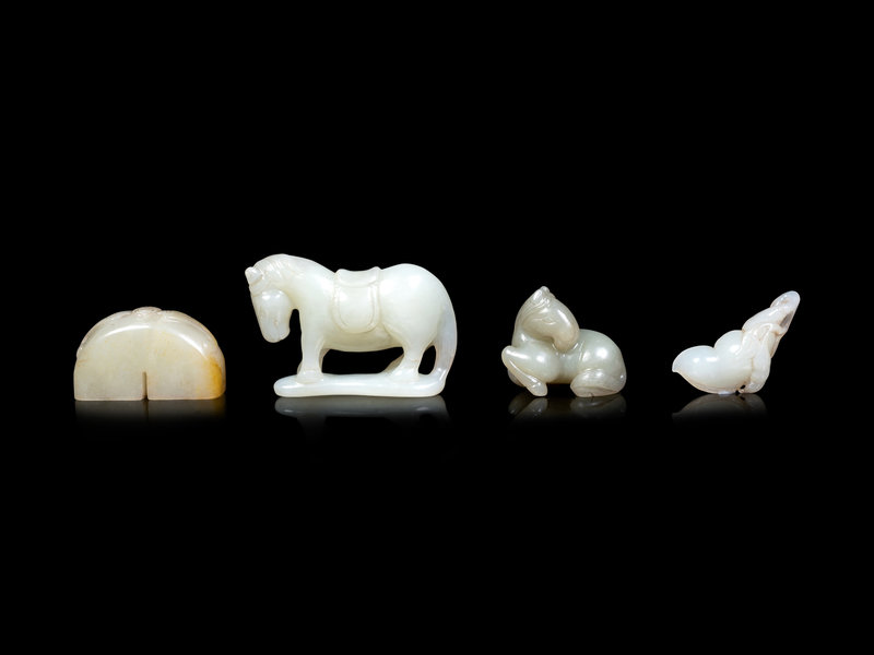 comprising two figures of horses, one standing and one recumbent, one seal carved in low relief with a bat, and one figure of a beanpod.