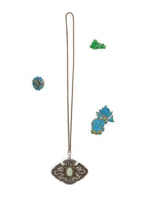 comprising a kingfisher feather silver mounted ear clip, a kingfisher feather metal mounted fish-form brooch, a jadeite inset silver necklace and a jadeite and gilt metal mounted brooch.