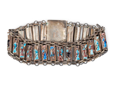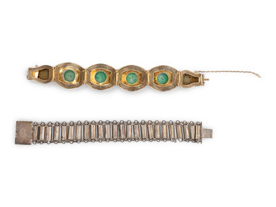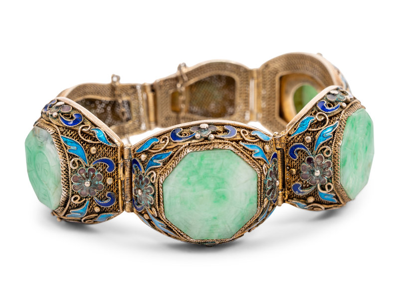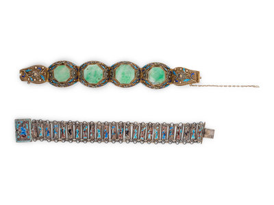 the first with four hexagonal apple green jadeite inset mounted in gilt metal and enamel filigree, the second of rectangular links enameled with figures.