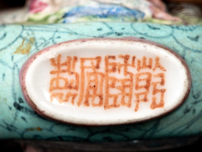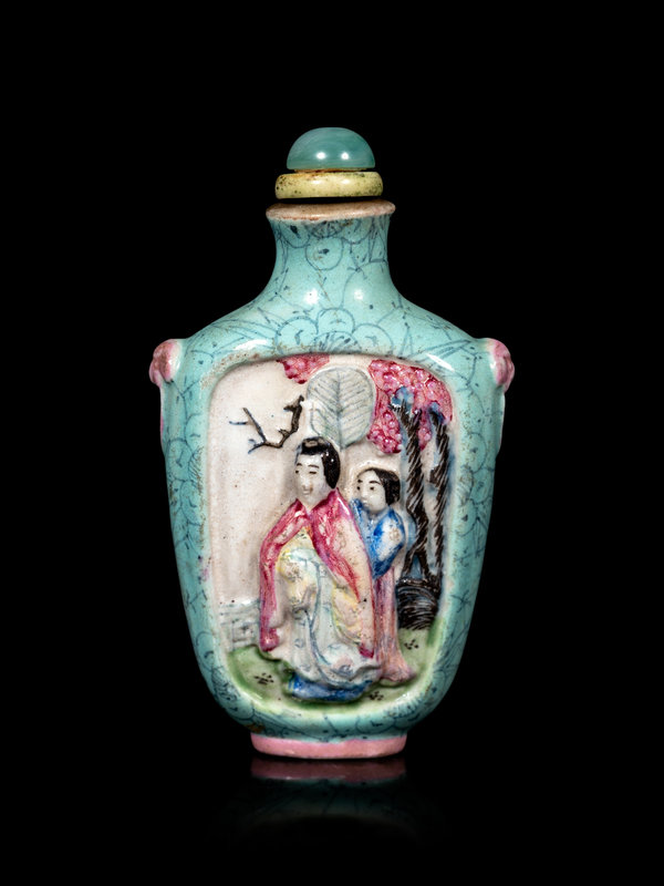 of compressed rectangular form with molded mock handles at the shoulder, with figures rendered in relief in reserves against a turquoise ground painted with prunus.