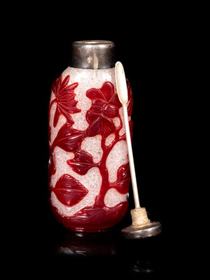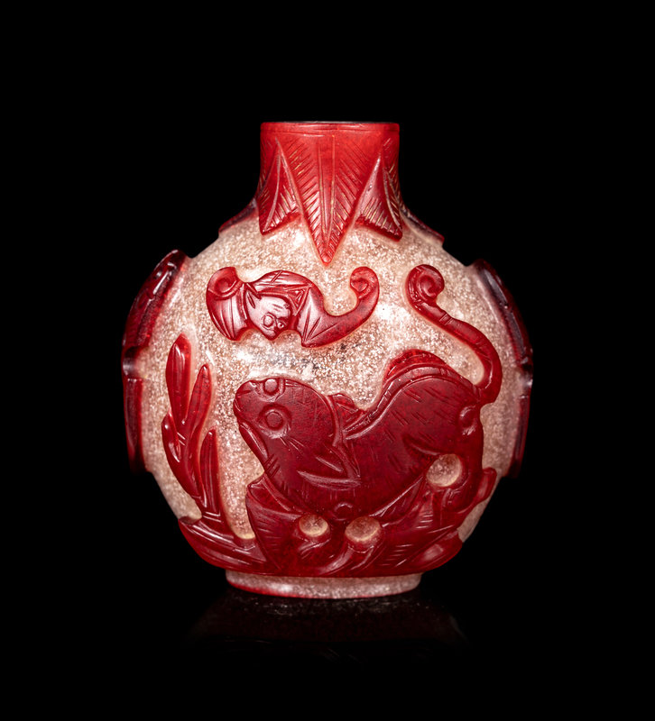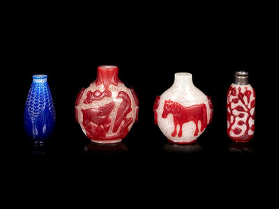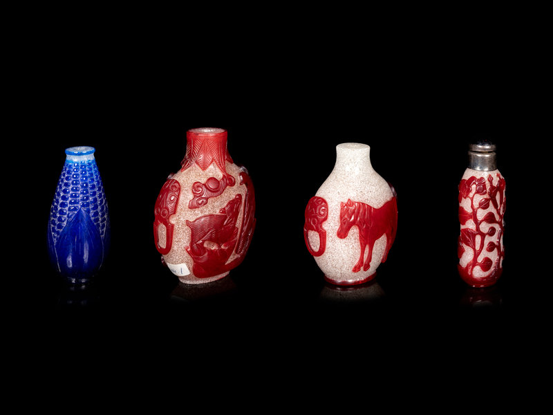 comprising three red overlay white examples, the first carved with birds, the second a horse, the third flowers, together with a blue overly white example imitating a corn.