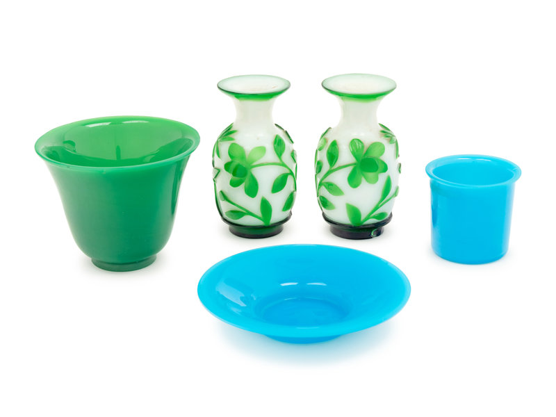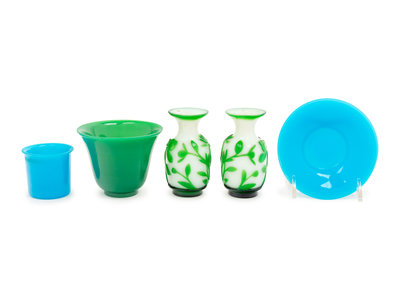 comprising two petite green overlay opaque white baluster form examples, one flaring green cup, and a cylindrical turquoise cup and saucer.