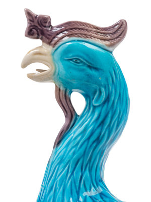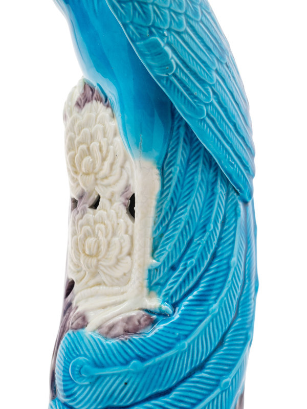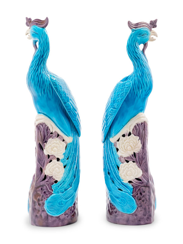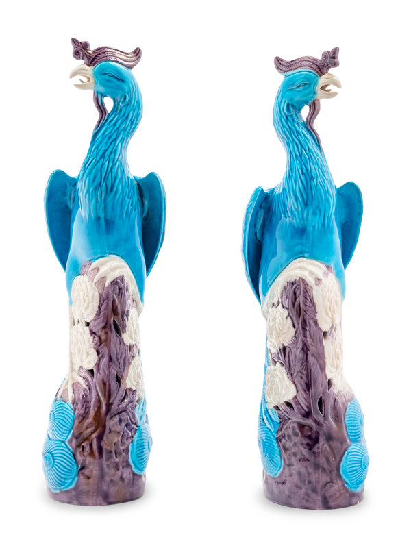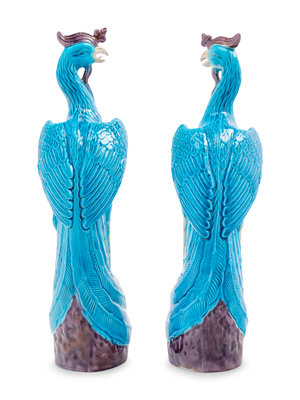 A Pair of Chinese Export Turquoise, White and Purple Glazed Porcelain Figures of Phoenixes