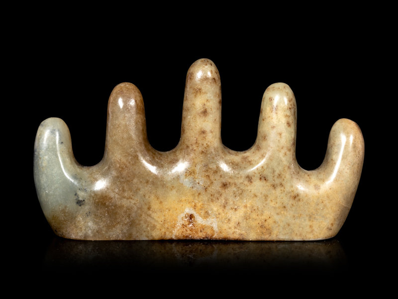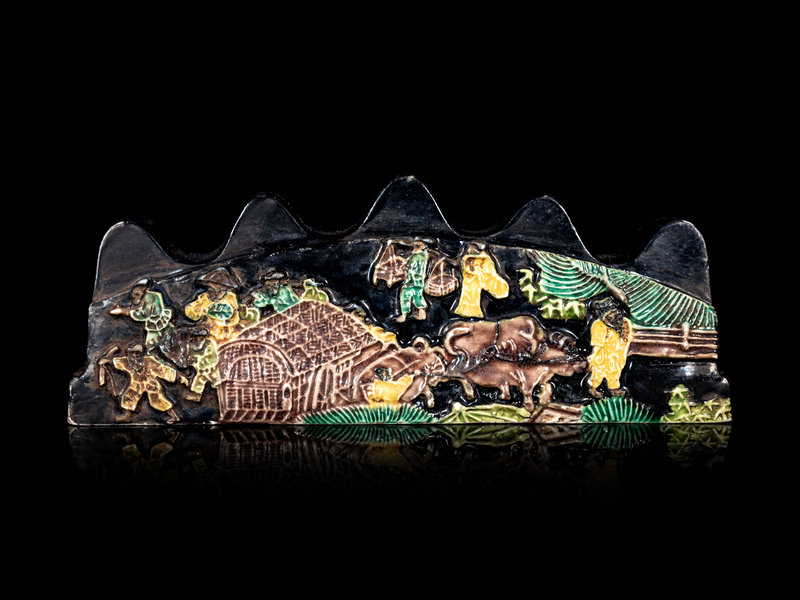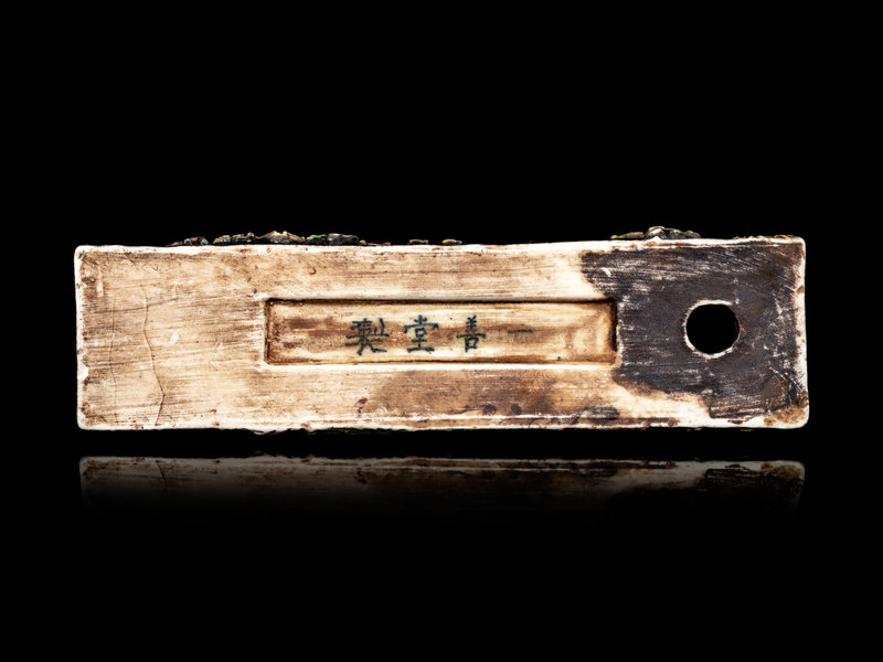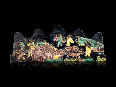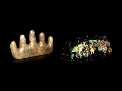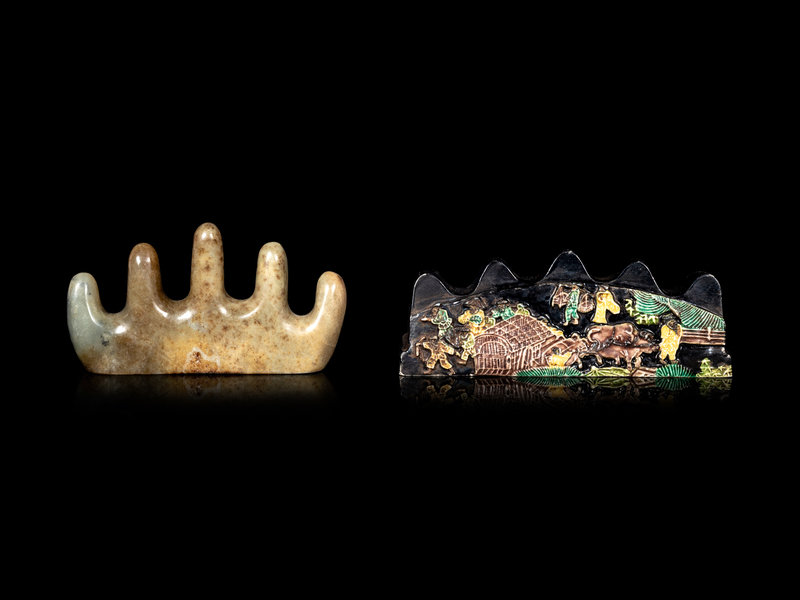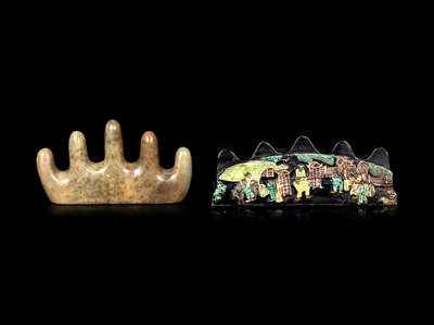 comprising one black ground porcelain example painted with figures, the second a smoothly polished hardstone example.