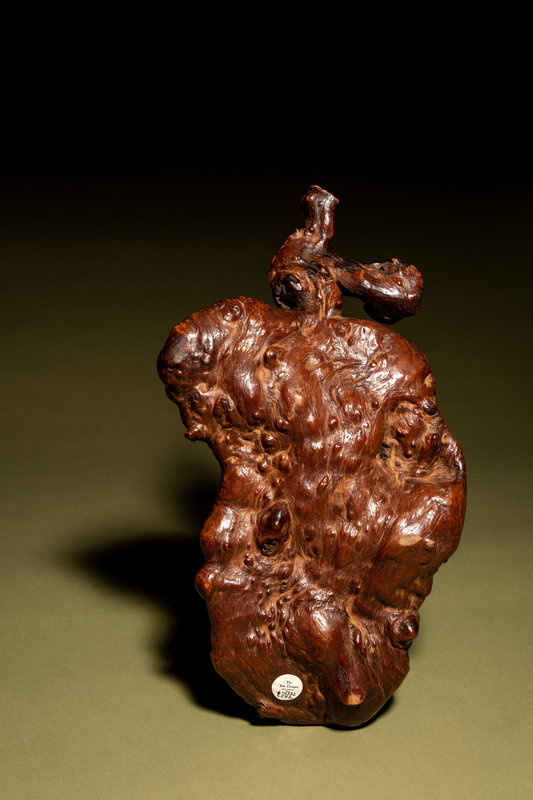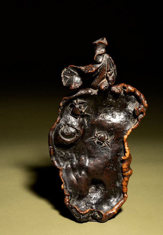 of large section in a loosely tapered form, the interior worked with carved spiders and lacquered black, the reverse showing undulating gnarled burls of varying size.
