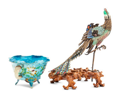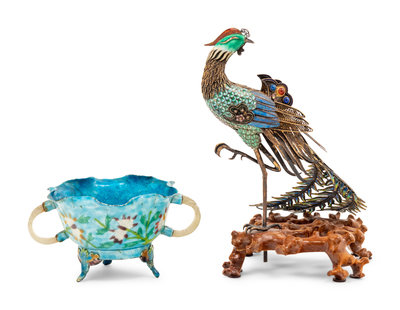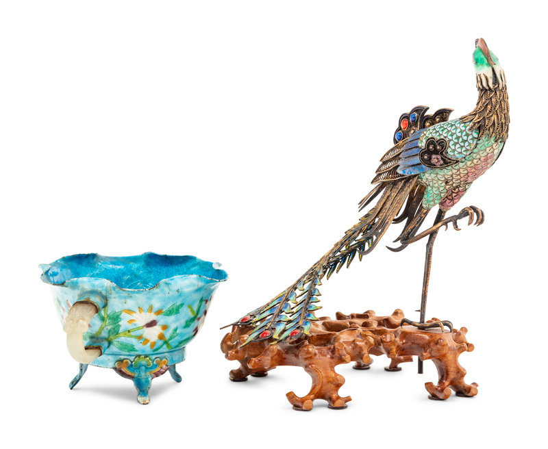 A Chinese Export Enamel on Silver Figure of a Phoenix and A Enamel on Copper Bowl