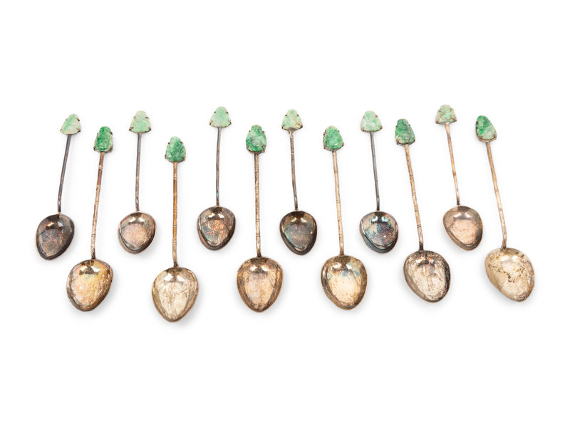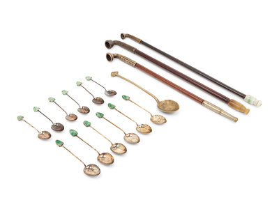 comprising a set of 12 export silver and jadeite teaspoons, one larger spoon, and three pipes.