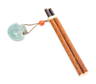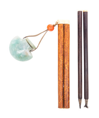 the purse-form dappled apple-green inkwell suspended beneath a round bead from the narrow double cylinder brush holder container a pair of bamboo brushes.