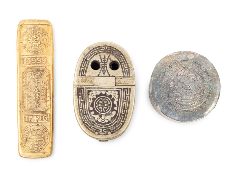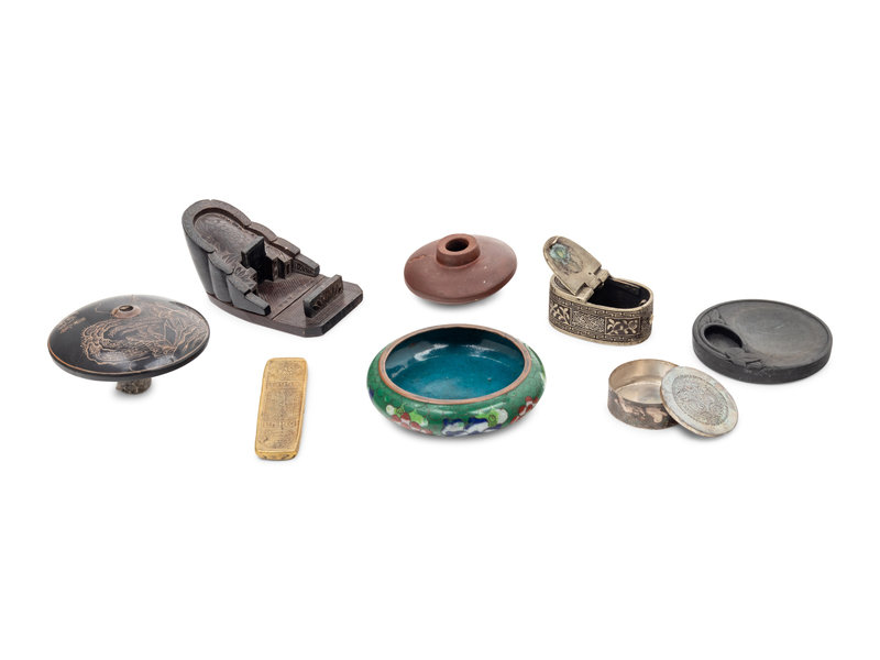 comprising an ink stone, a copper bar, two bronze covered boxes, two opium lamps, a toy and a cloisonne enamel washer.