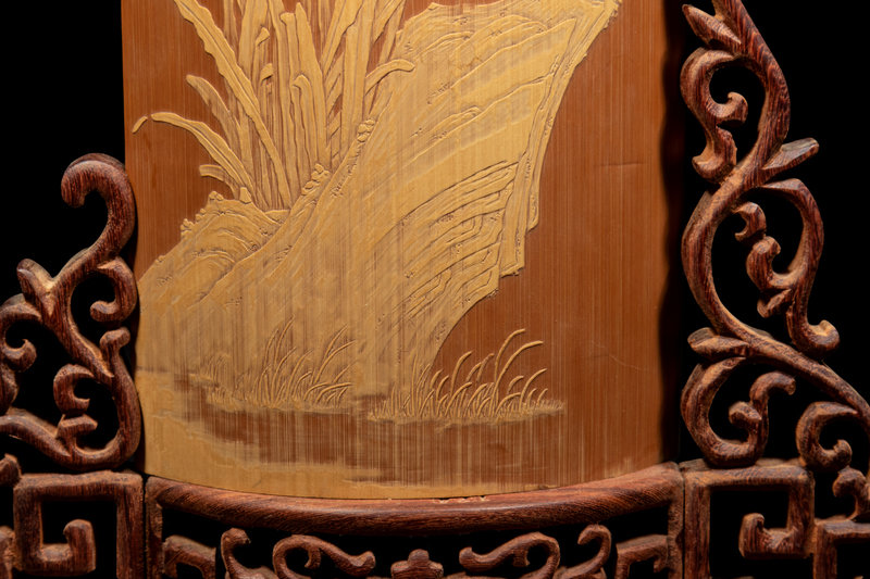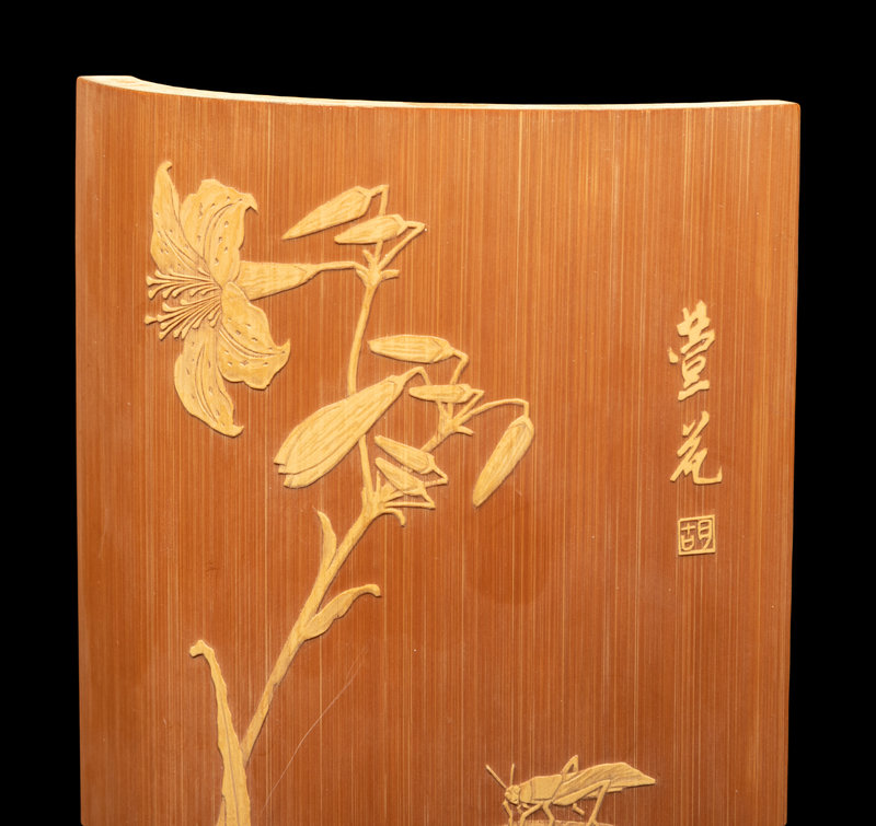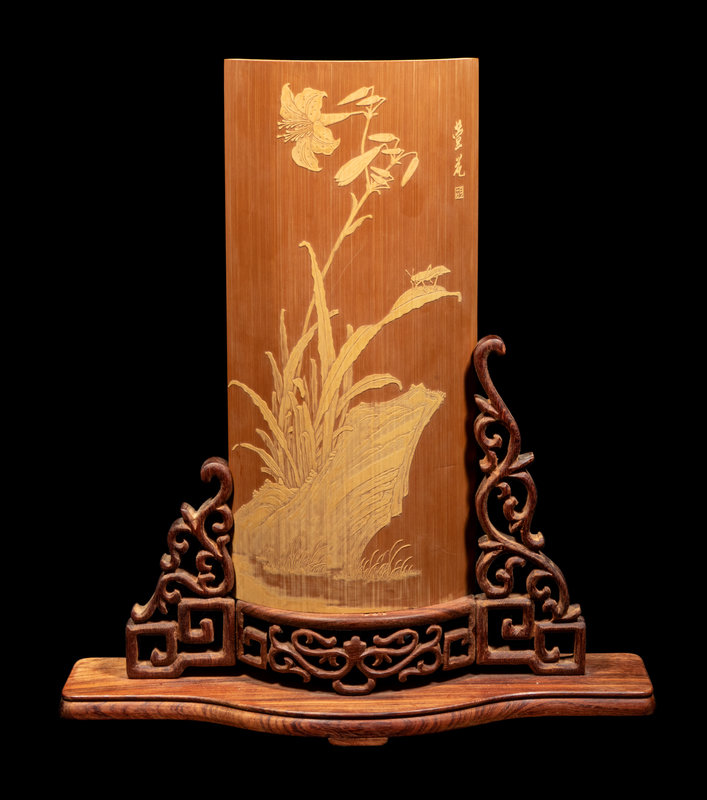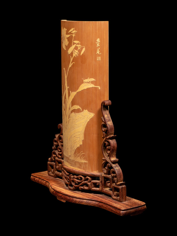 worked in low relief to show a narcissus stem, and raised above a reticulated hardwood stand as a table screen.