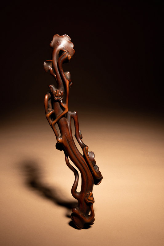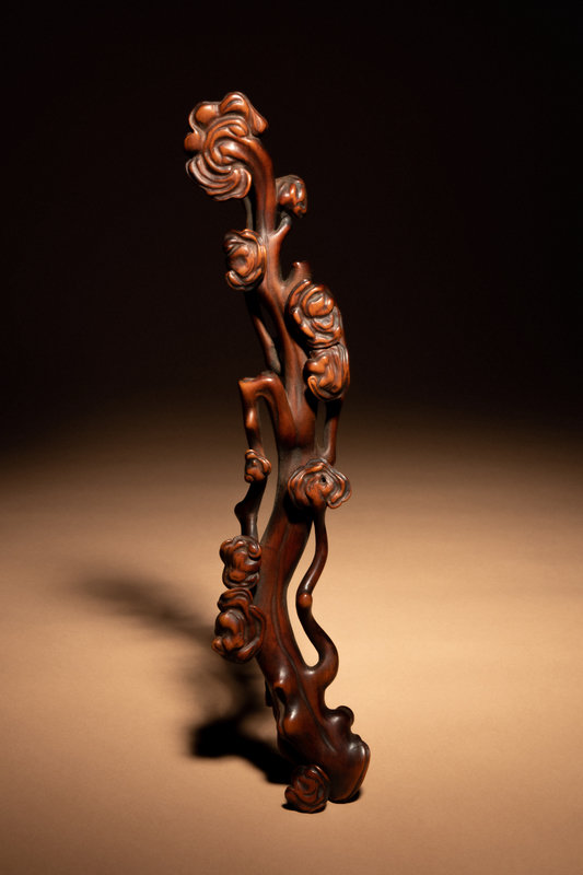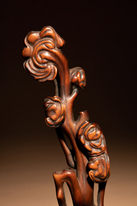 carved in the form of lingzhi with one cap for the head and smaller lingzhi caps climbing up the shaft, with a rich patina.