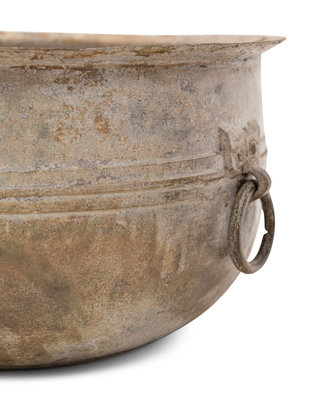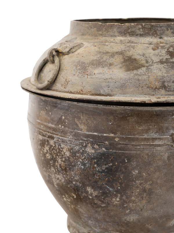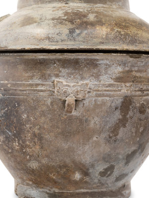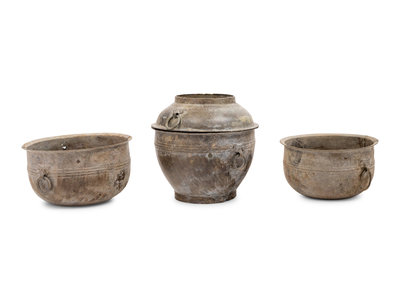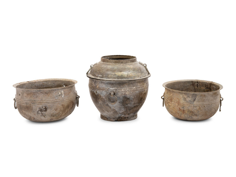comprising two globular examples with wide mouths flanked by ring handles, and one similar example raised above a straight foot and surmounted by a cover.