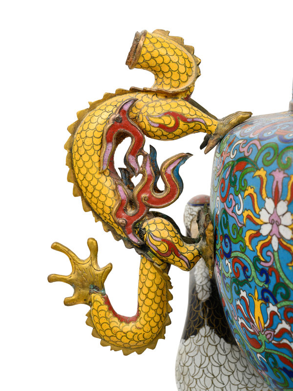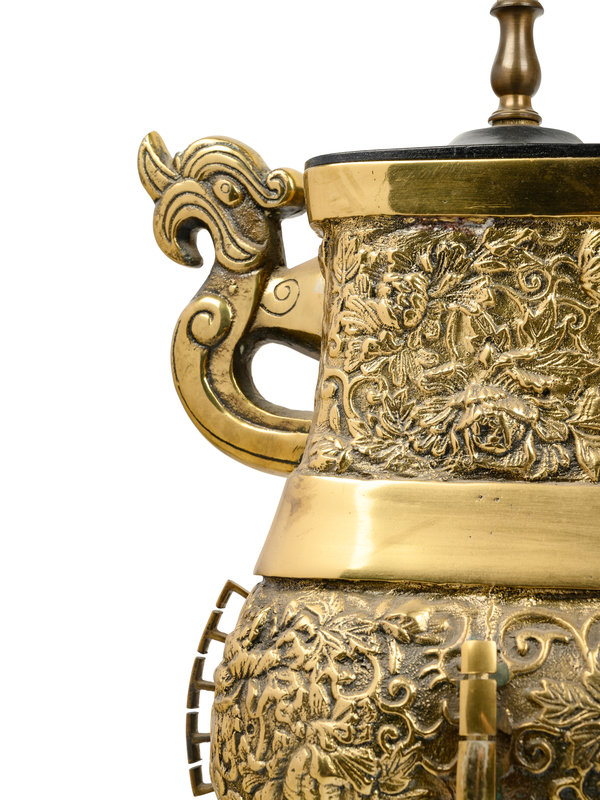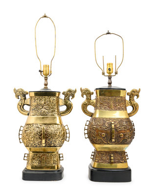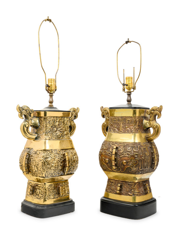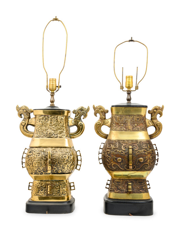 each cast with taotie masks and flanked by sinuous handles to either side, mounted as a lamp.