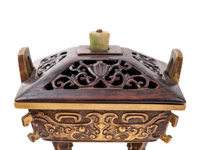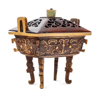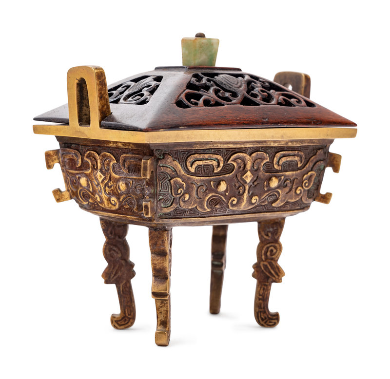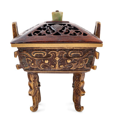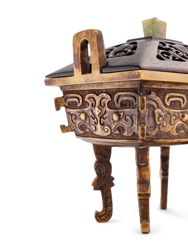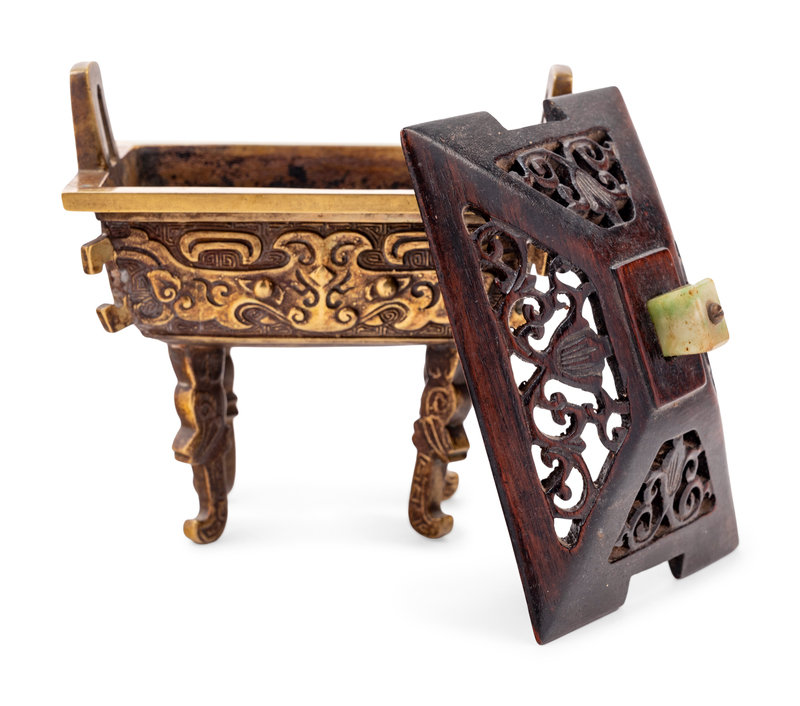 the rectangular body cast with taotie masks divided by flanges, supported above four slender curvilinear leg, all surmounted by reticulated hardwood cover terminating in a hardstone finial.