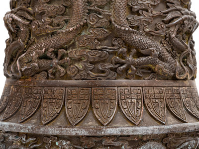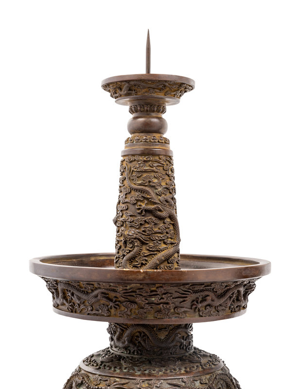 each with a bell form body supporting a long pricket, cast in relief with dragons in profile against a ground of scrolling clouds.