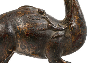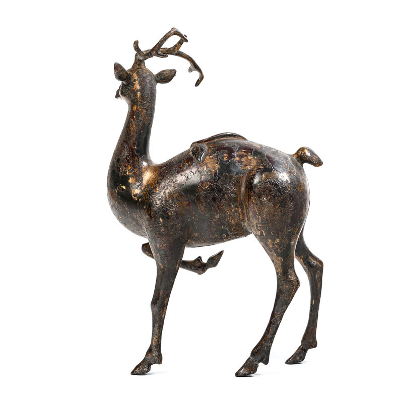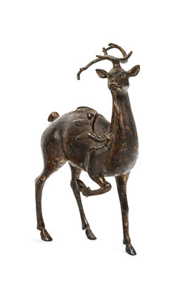 standing above three cloven feet to support a rotund belly and puffed chest, with the neck crane up to toss back the head of antlers.