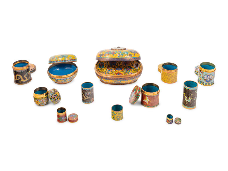 comprising three petite brush containers, seven cylindrical boxes and covers, and two two round boxes and covers, one mounted with a reticulated hardstone pendant.