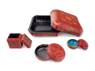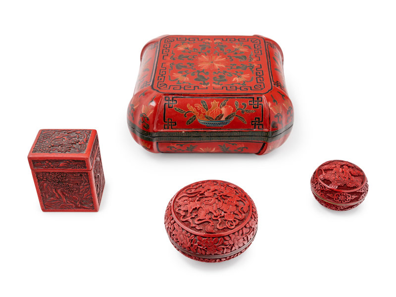 the first a rectangular example worked with a landscape, the second with painted polychrome floral motifs, the remaining two circular examples, the first with mythical beasts, the second figures.