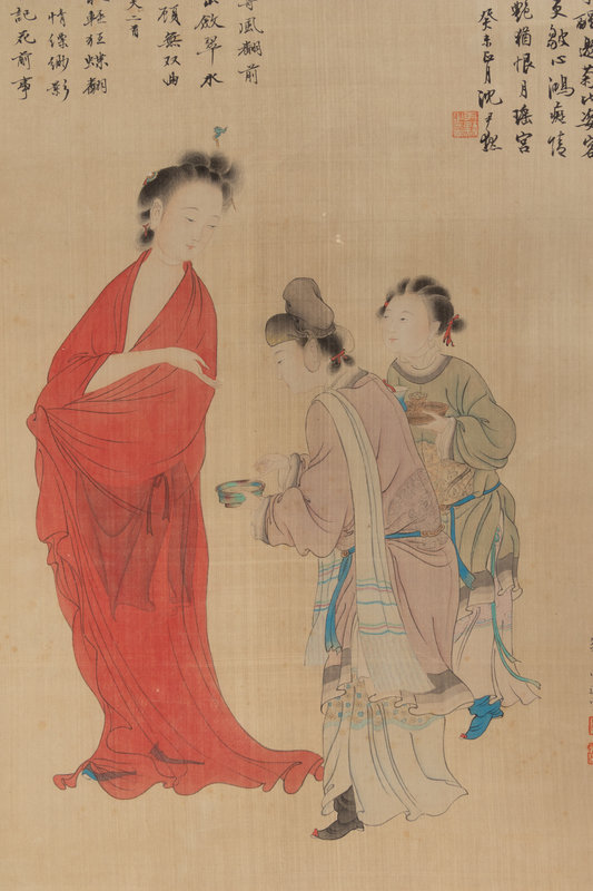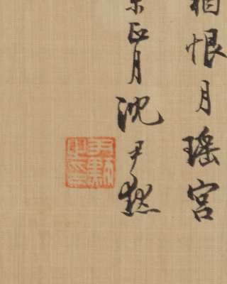 題跋:只影沈香亭畔,瓊漿自染胭紅。欄桿斜倚意初濃。半酣猶半醒,邀菊比姿容。餐饈如何煞怨,琵琶更皺心鴻。癡情偏笑不相逢。當時花正艷,猶恨月瑤宮。湖帆門下心遠生屬題。癸未(1943)正月,沈尹默。