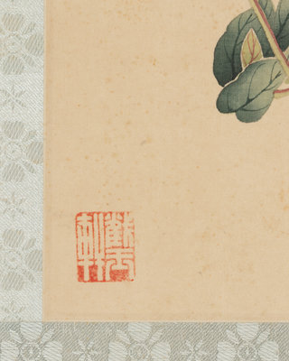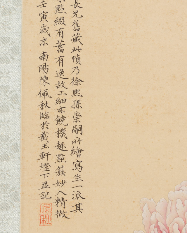 款識:玉岑長兄舊藏此幀,乃徐熙孫崇嗣所繪寫生一派,其渲染點綴有蓄有逸,故工細亦饒機趣,點簇妙入精微矣。壬寅(1962)嵗末南陽陳佩秋臨于截玉軒燈下並記。