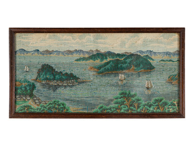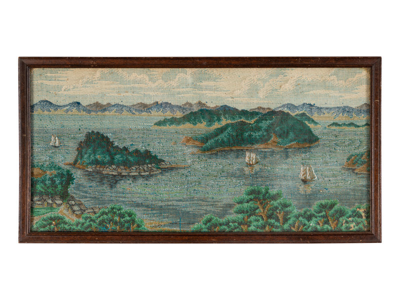 comprising an embroidered silk panel, a woven silk panel and a needle point example.