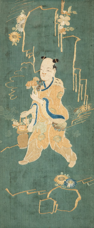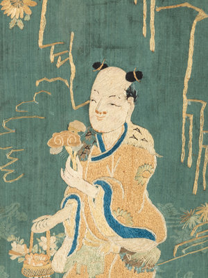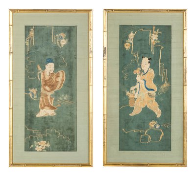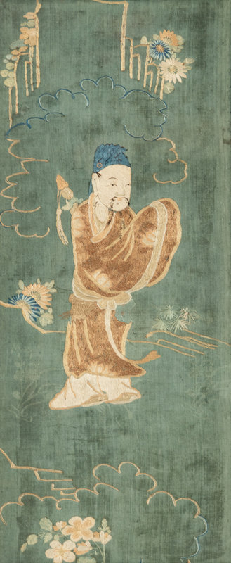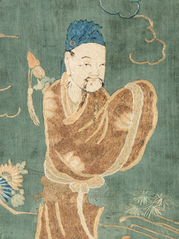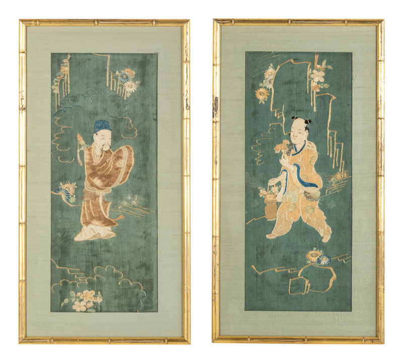 each of rectangular form showing immortals in a stylized landscape rendered with satin stitches in soft muted golden tones against a jade green ground.