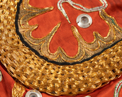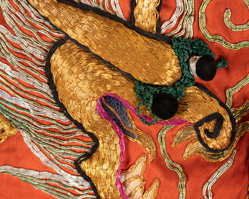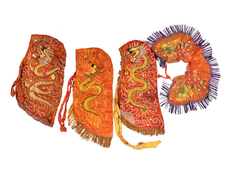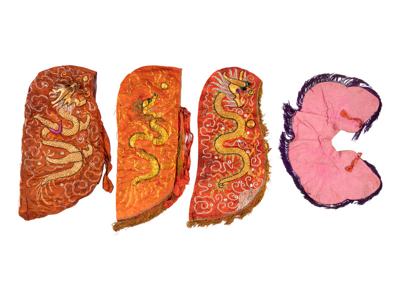 comprising three hoods and one collar, each worked in high relief with gilt metallic threads to show dragons, and finished with a tasseled fringe.