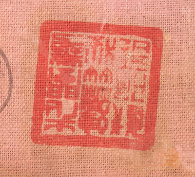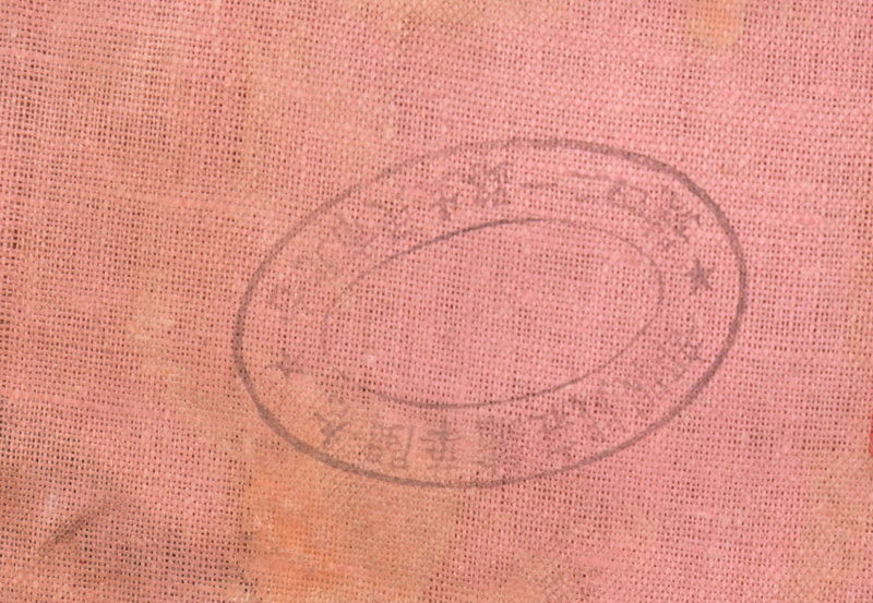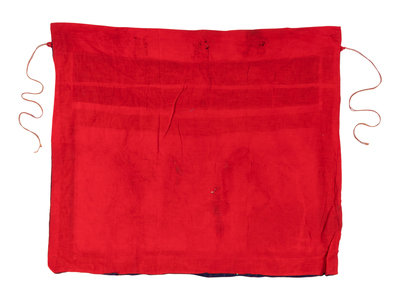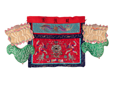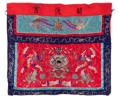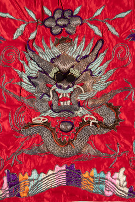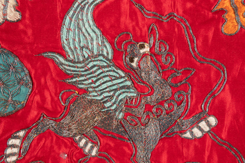 comprising a red ground table frontal worked in polychrome and metallic threads to show a front-facing dragon surrounded by phoenixes and mythical beasts, and four padded lotus decorations.
