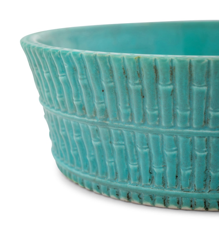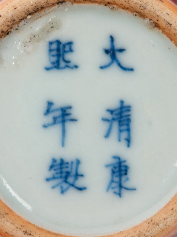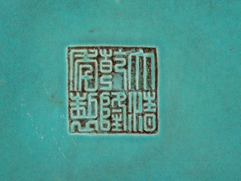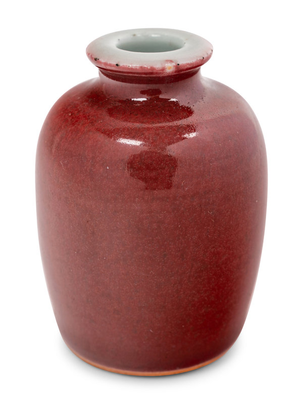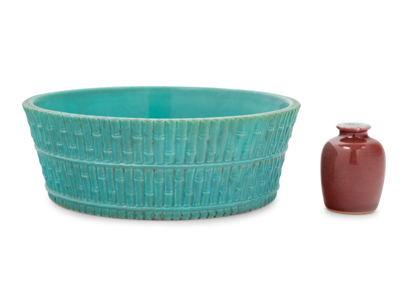 the first a turquoise glazed brush washer with sloping sides rising from a straight foot, decorated to the exterior with three horizontal molded bamboo stalks, Qianlong mark; the second a petite copper red glazed jar, the underside bearing a six-character Kangxi mark.